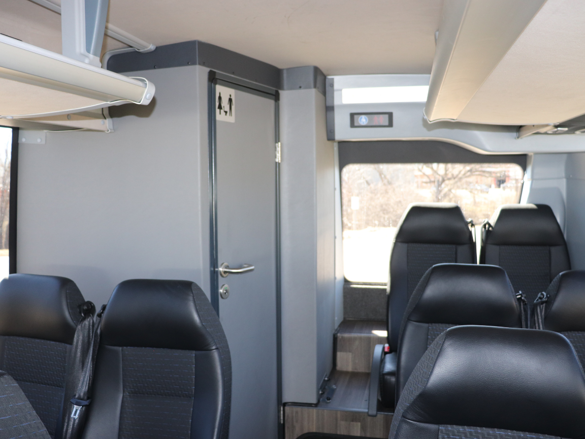 The GO Riteway minicoach is a great option for special events, moving a corporate group, or providing an employee shuttle. These 34-passenger minicoaches are perfect for smaller groups. They feature a walk-in entrance and center aisle with 2-across seating in plush, high-back, front-facing seats.